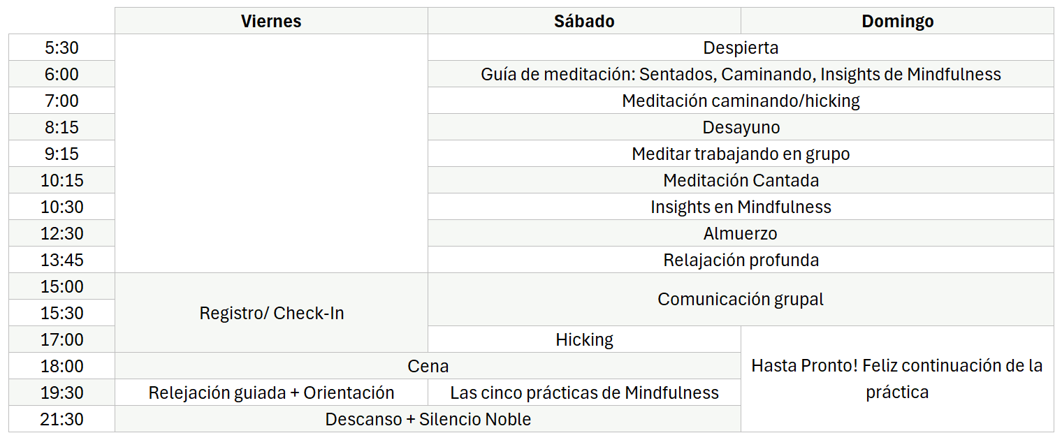 El precio de este servicio incluye hospedaje, alimentación, bebidas, y también el IVA. Los cupos disponibles para cada fin de semana está limitado a la cantidad de dormitorios disponibles. Los participantes pueden elegir las habitaciones compartidas (a partir de las 9:30 todos practicamos Silencio Noble, por lo que no es incómodo estar en habitaciones compartidas), o habitaciones privadas.